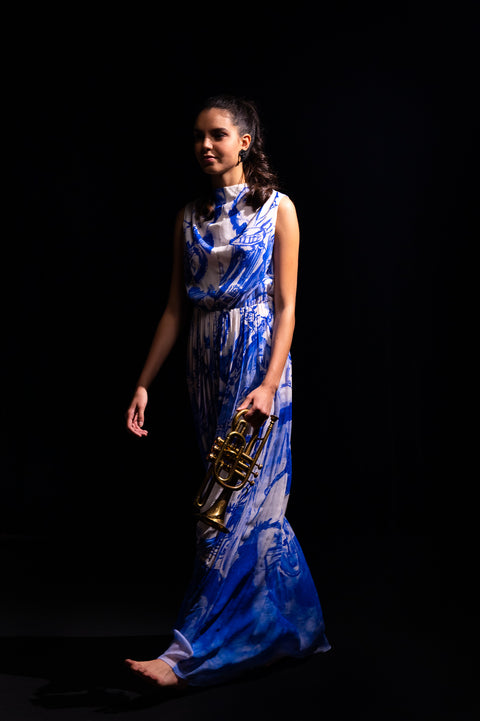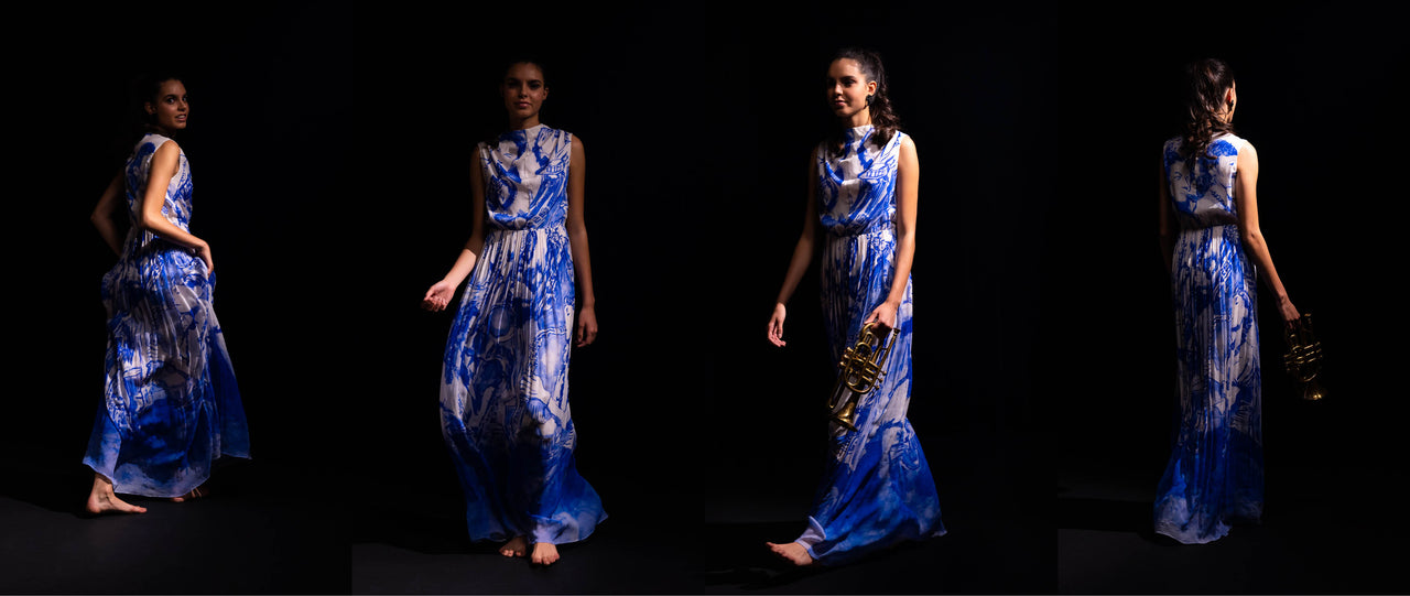 THE BLUE NOTE - With this collection we pay homage to the timeless, deep moods and tones which only jazz music can evoke. We use a rich variety of silks and wool to create these classic lines using both understated as well as more literal motifs such imagery of musical notes and musicians. Dark ombre features prominently in the collection. Craftsmanship, as always, takes center stage, with hand embroidered motifs and our signature geometric patch technique throughout. These enduring beauties should be reused, passed on and teamed with things already in your wardrobe.