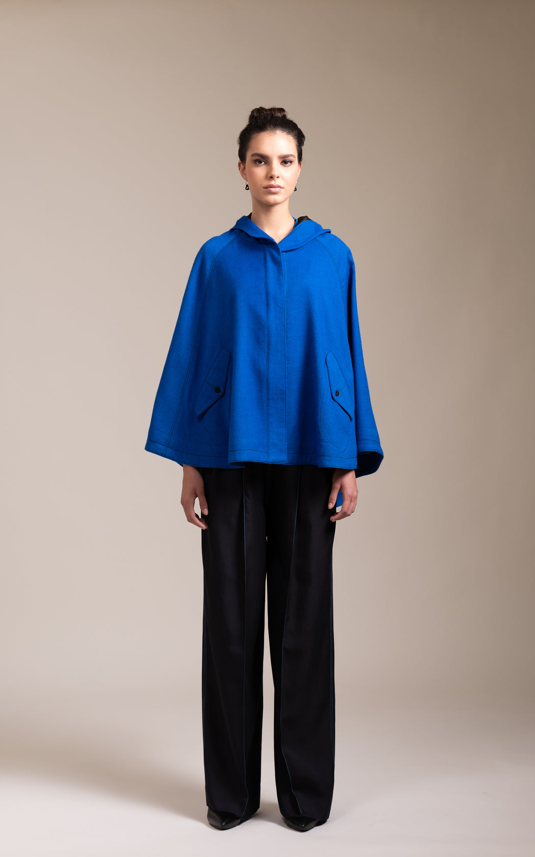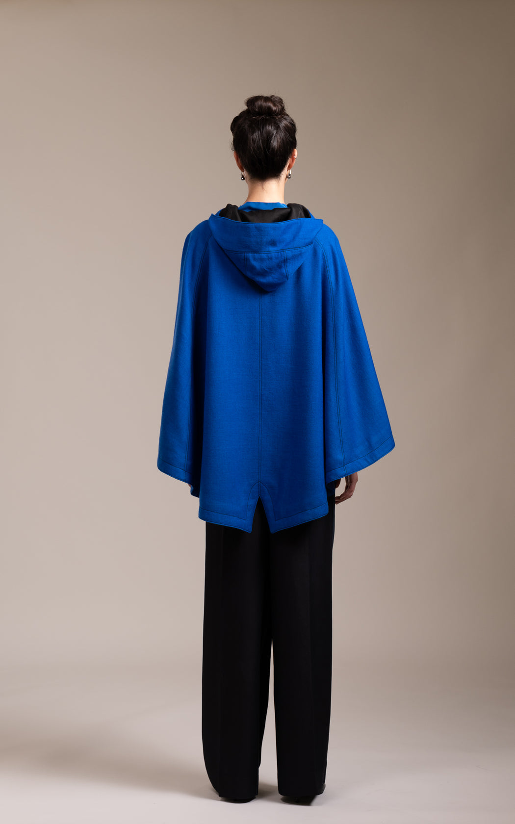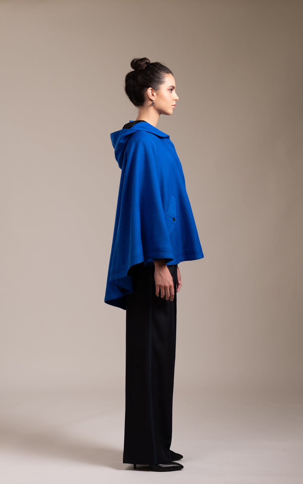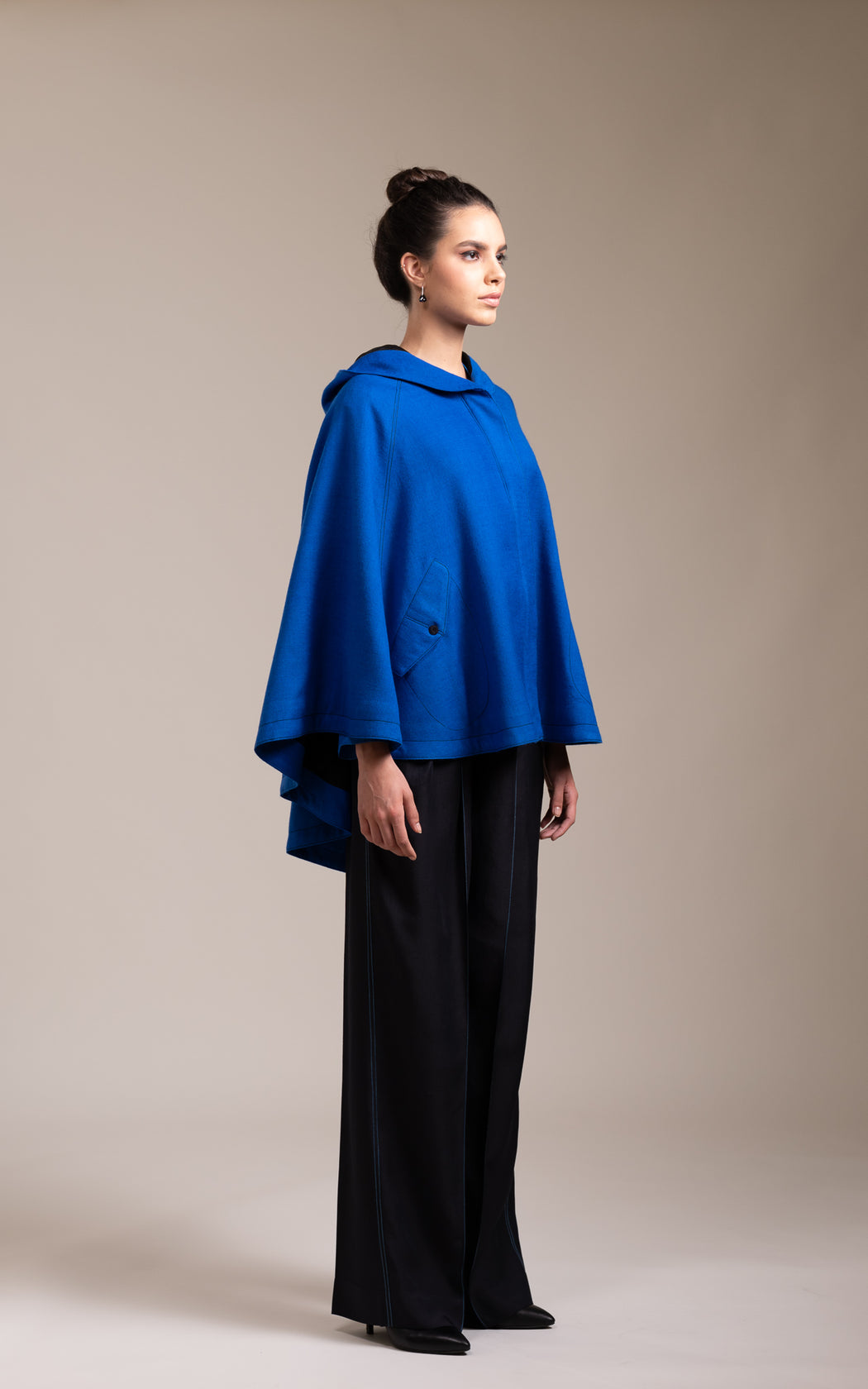 Our silk wool cape with hoodie is relaxed fit and comes in one size only, with contrast stitch line. The cape is fastened with front buttons and also has two front pocket. The cape is fully lined with contrasting fabric in black. Handcrafted in India.