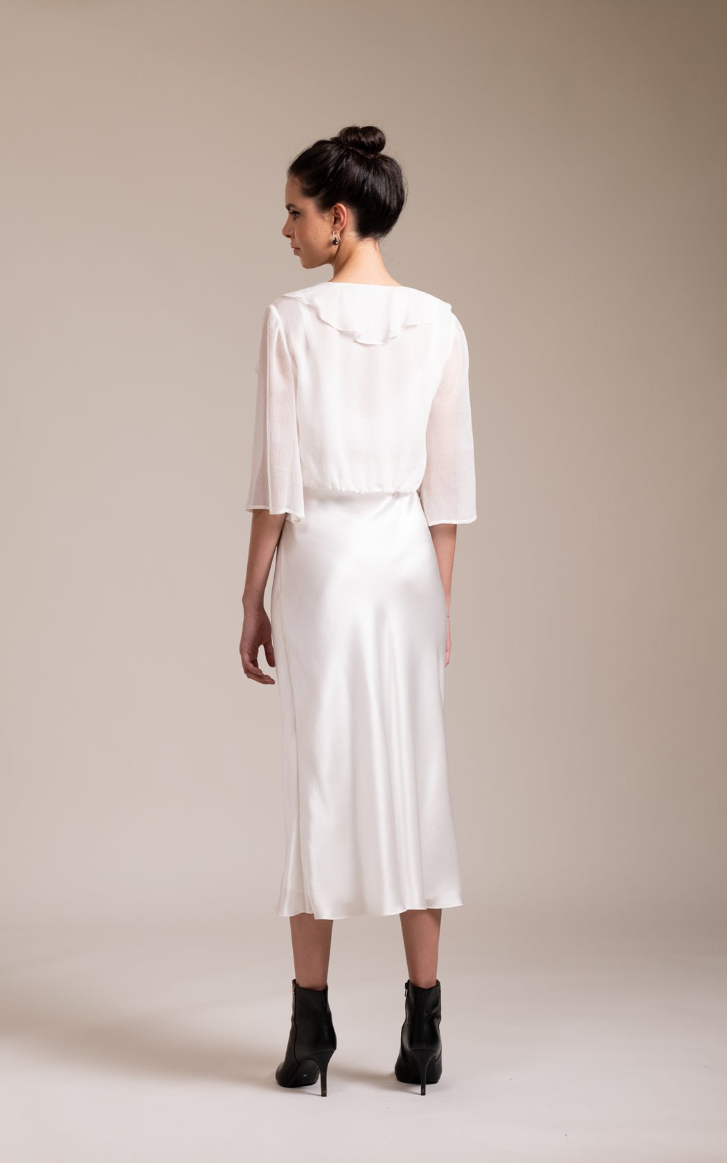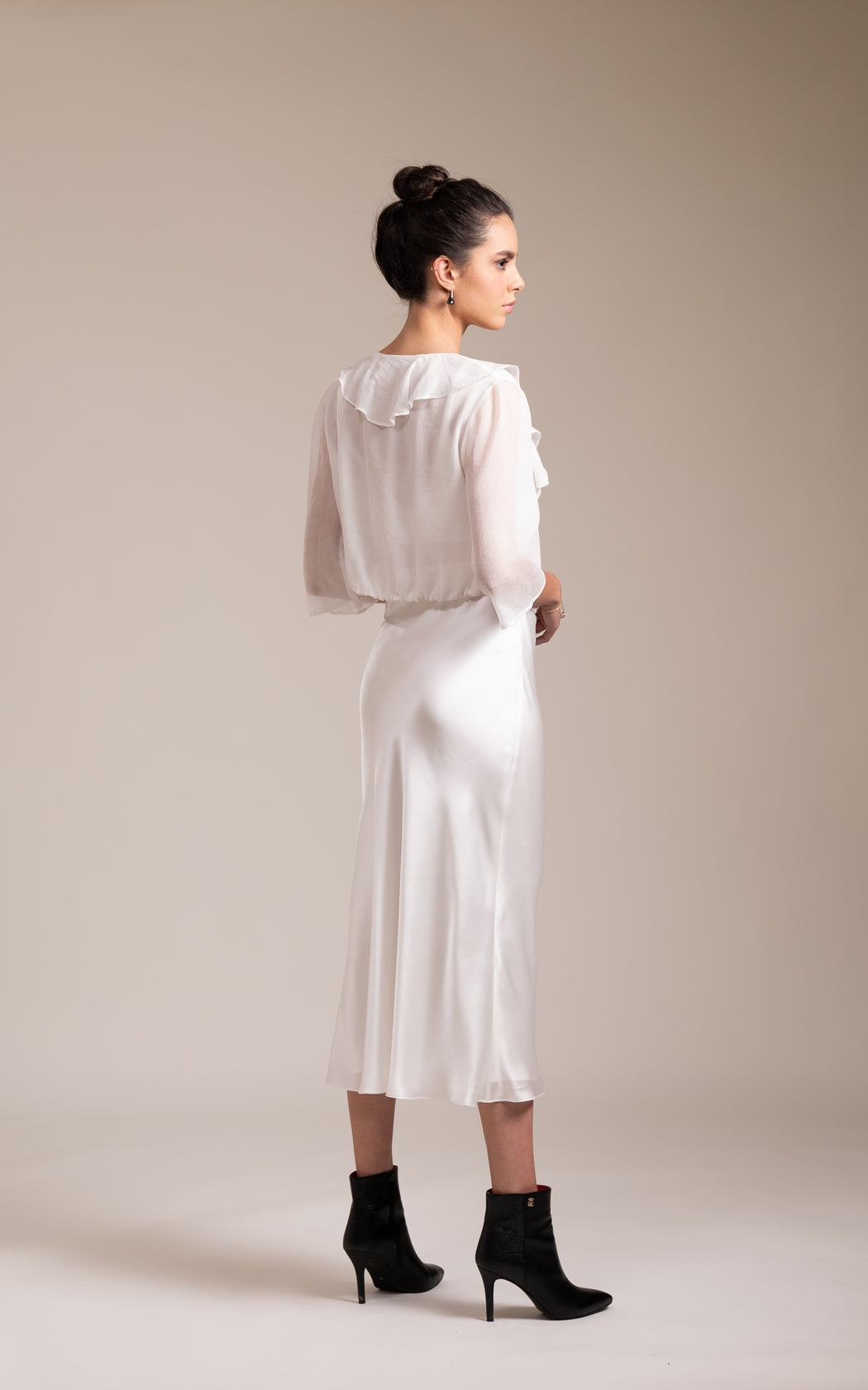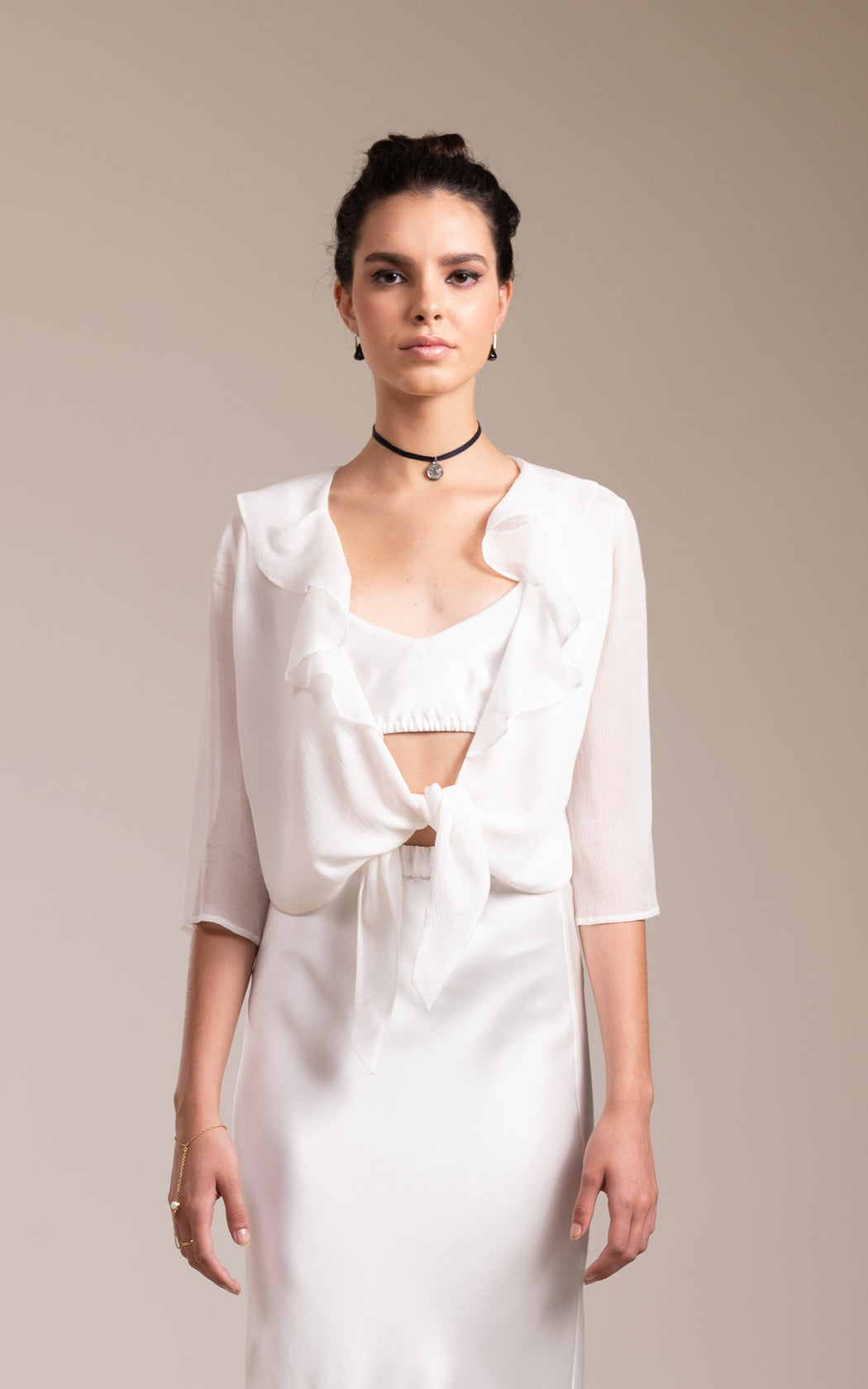 This draped front tie chiffon top is perfect cover up for a dress or inner. This effortless top is relaxed fit, practical and breathable. Combine with one of our collection's bottoms, such as the slip dress or Skirt, to make a perfect outfit for that casual chic lunch.The top can be made in any colour on request. Inner can be provided on request at extra cost. Handcrafted in India.