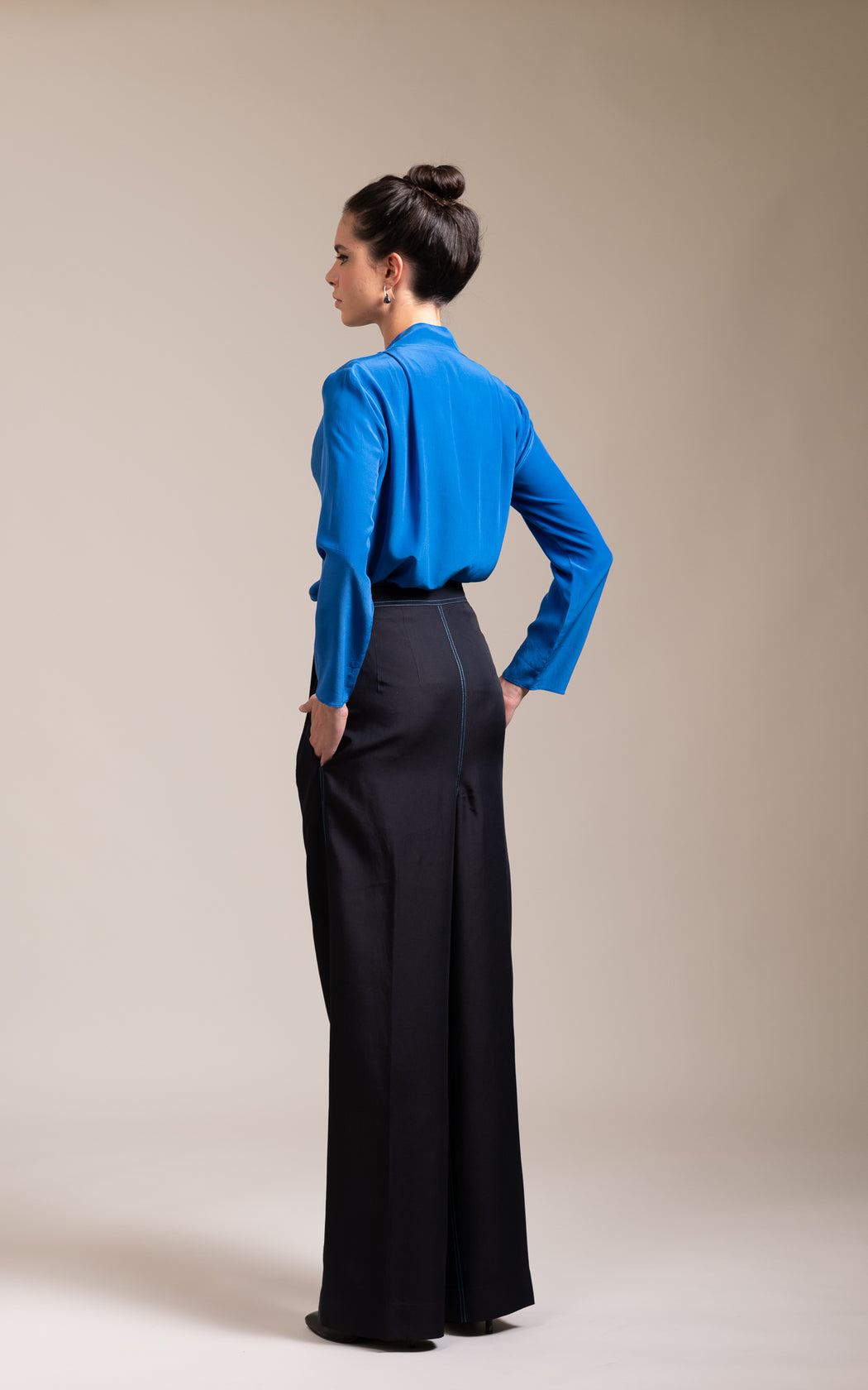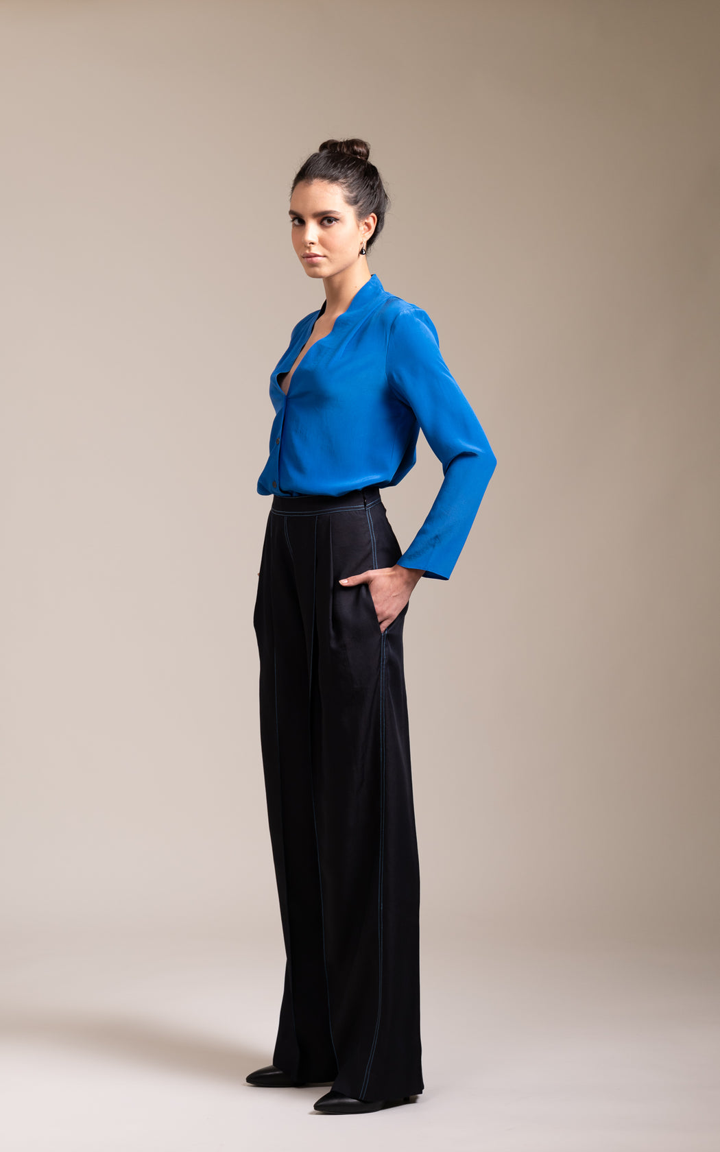 This wide leg pant stands out with its contrasting stitch details in silk thread. This trouser is lined with very lightweight cotton viscose for comfort and has pleats at the waist with side pockets. Dry clean only and Made in India.