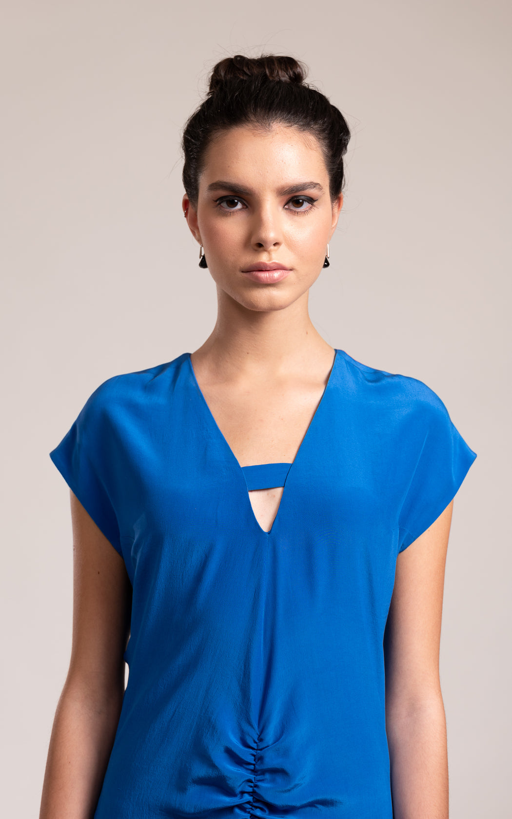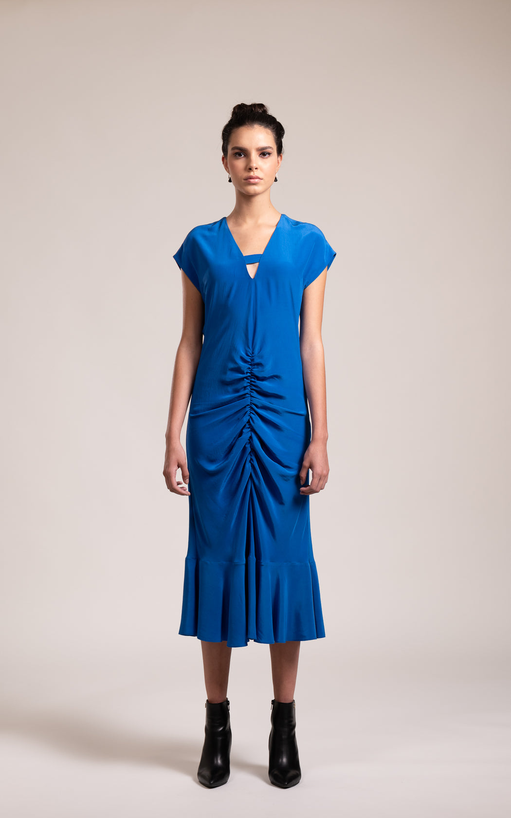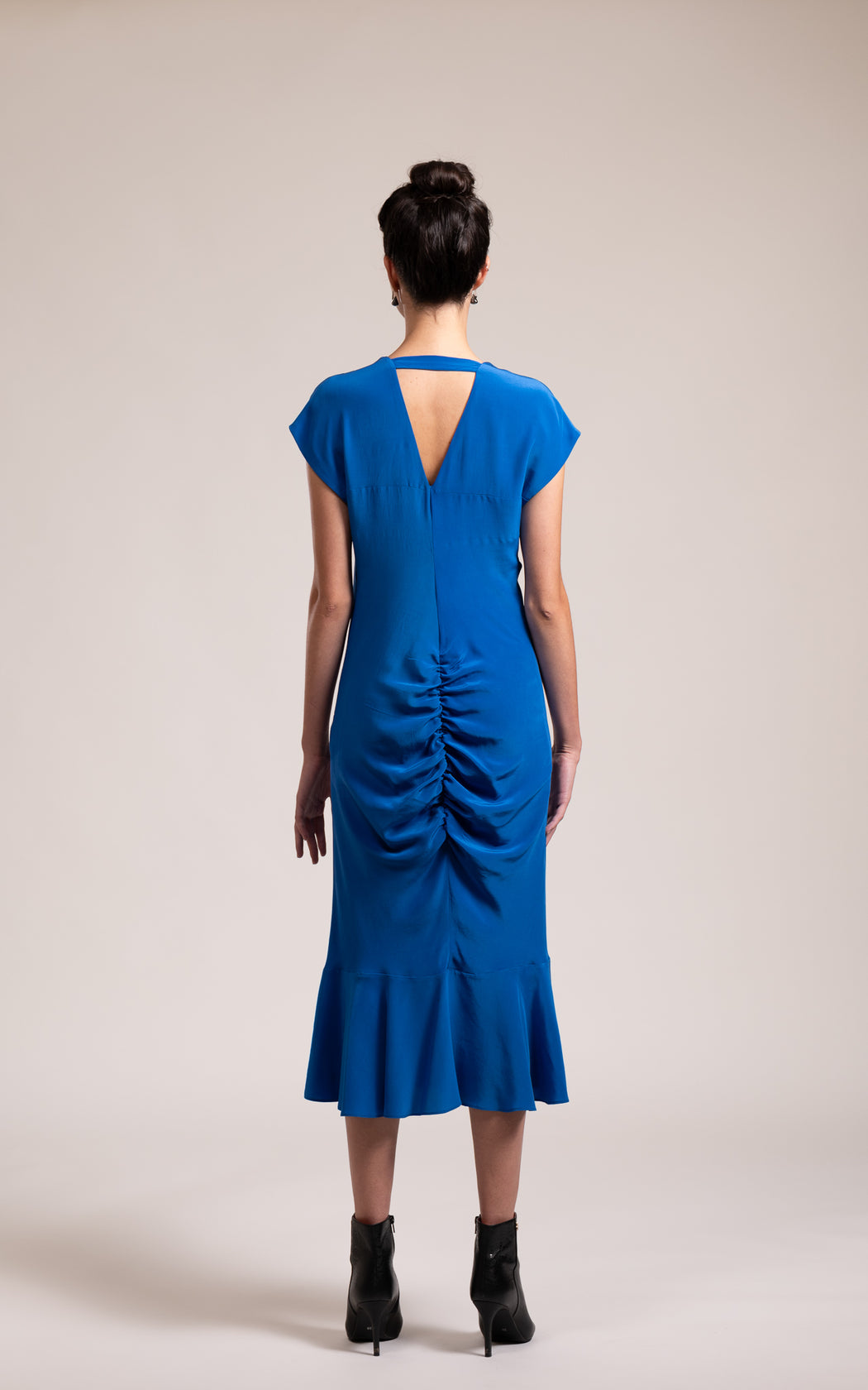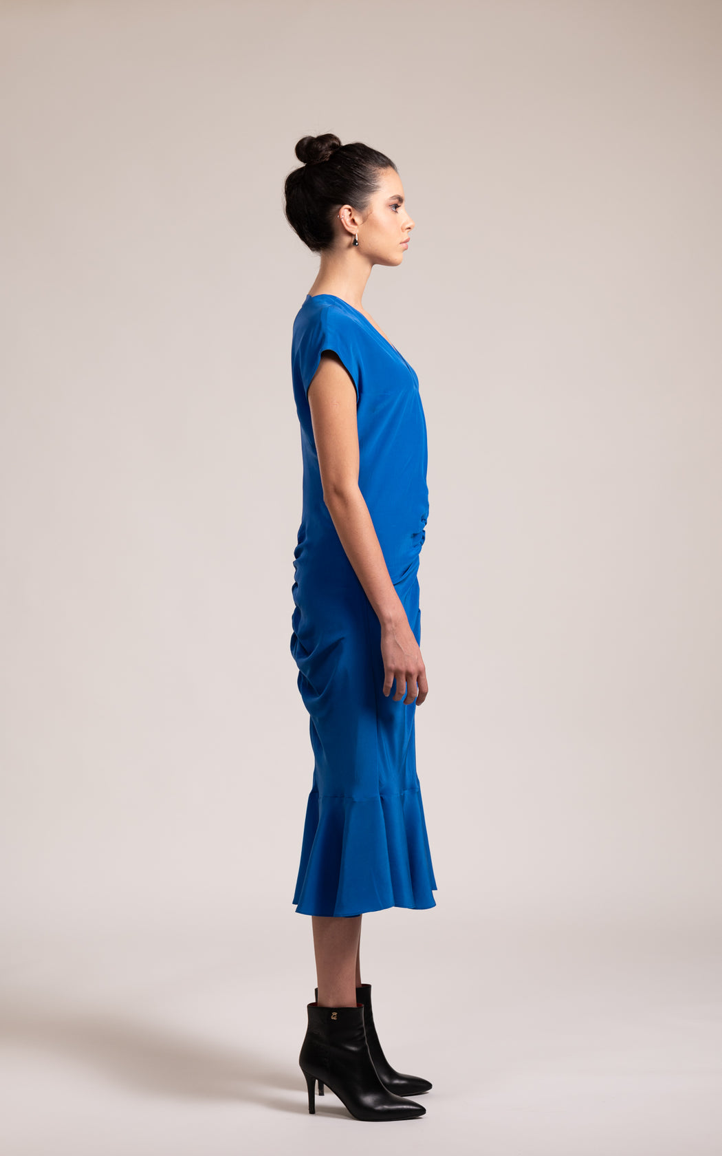 Our draped and gathered peplum dress relaxed fit and yet shapely. The dress has invisible side zip fastening.The dress can be made in any colour on request. This can be a goto permanent item in your wardrobe. Handcrafted in India.
