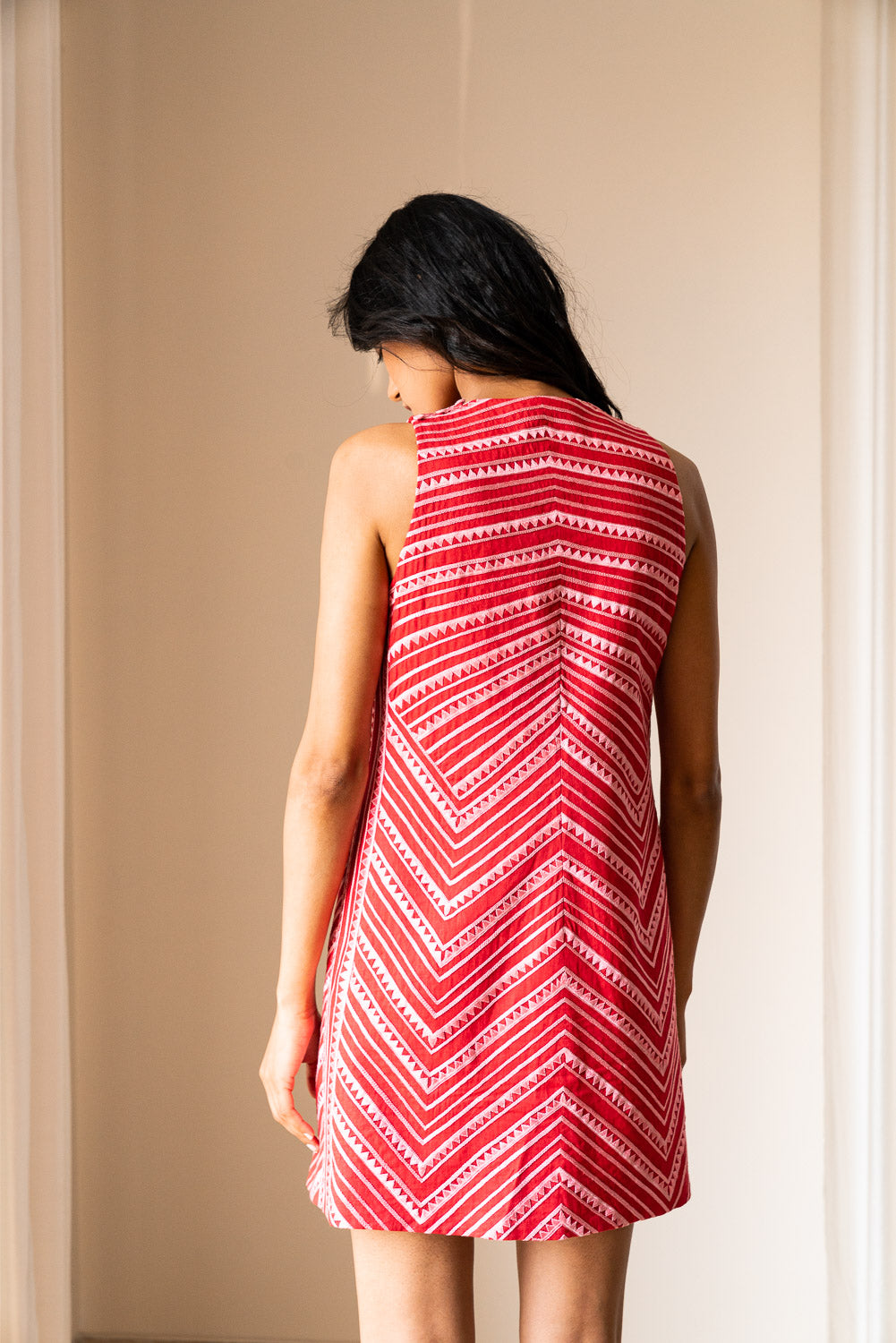 This A-line dress is hand-embroidered with silk thread in striped triangular pattern. This dress is lined with very light weight cotton mulmul and has conceal zip. The fit overall is relaxed, making it a perfect summer dress. Handcrafted in India.