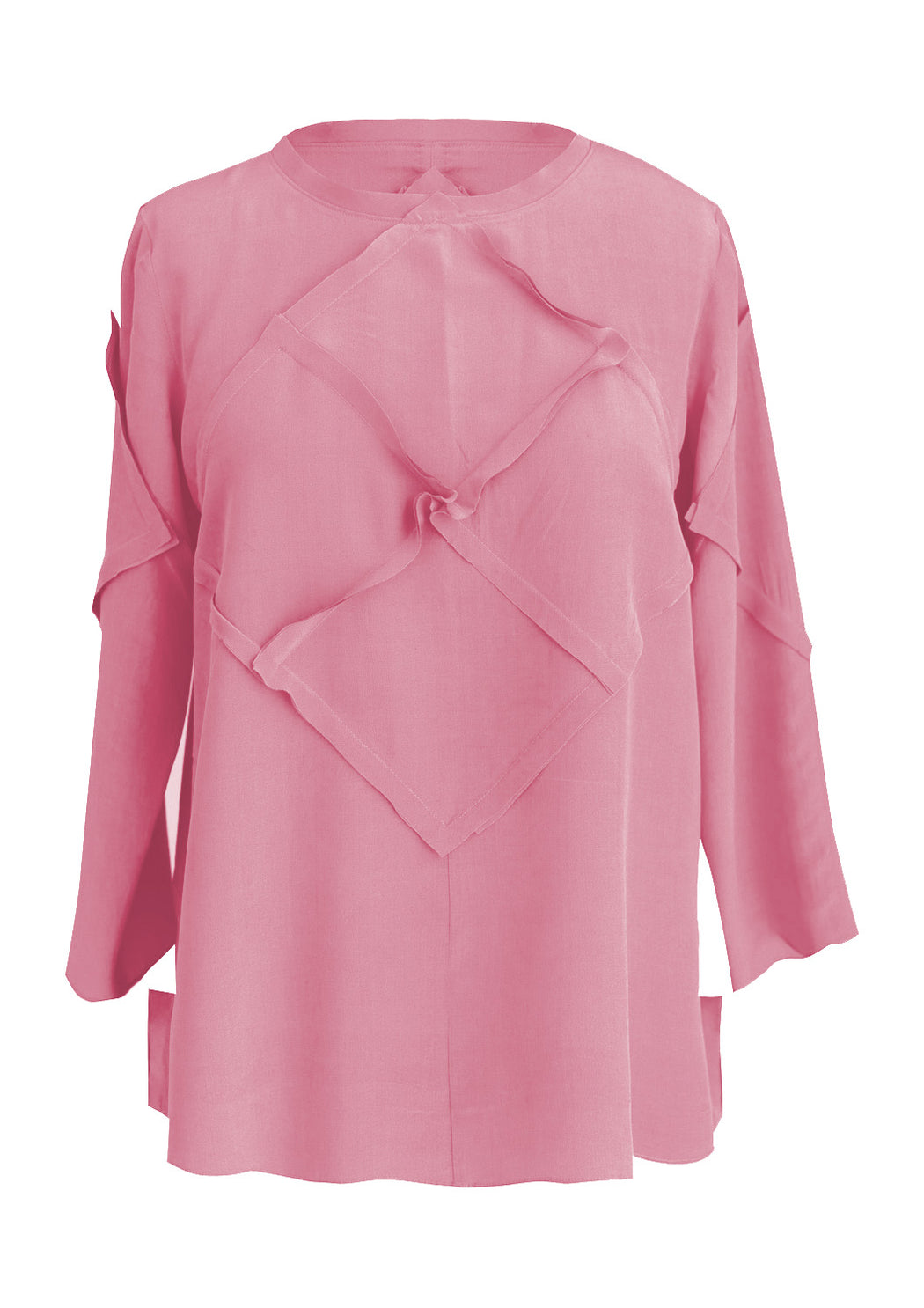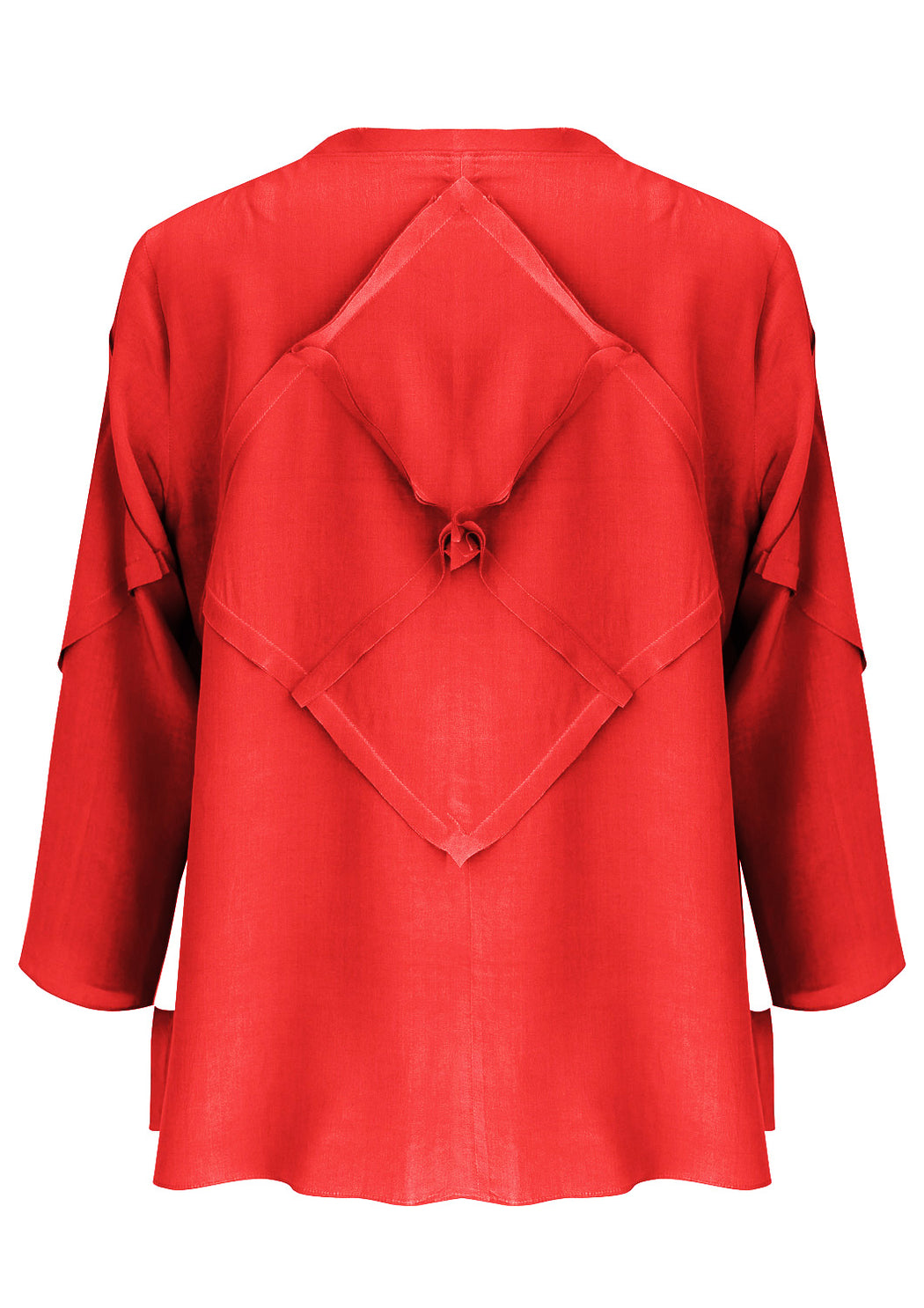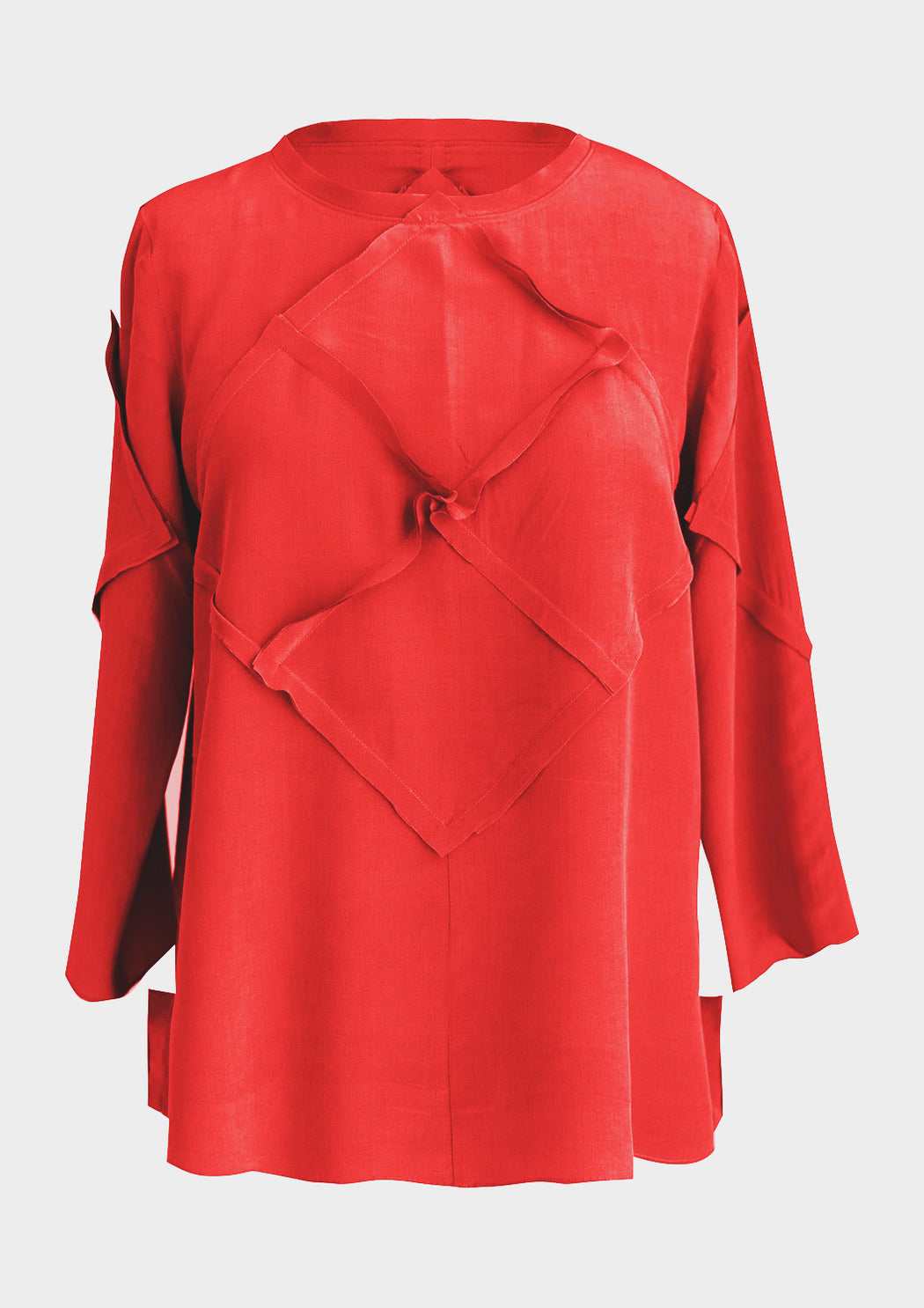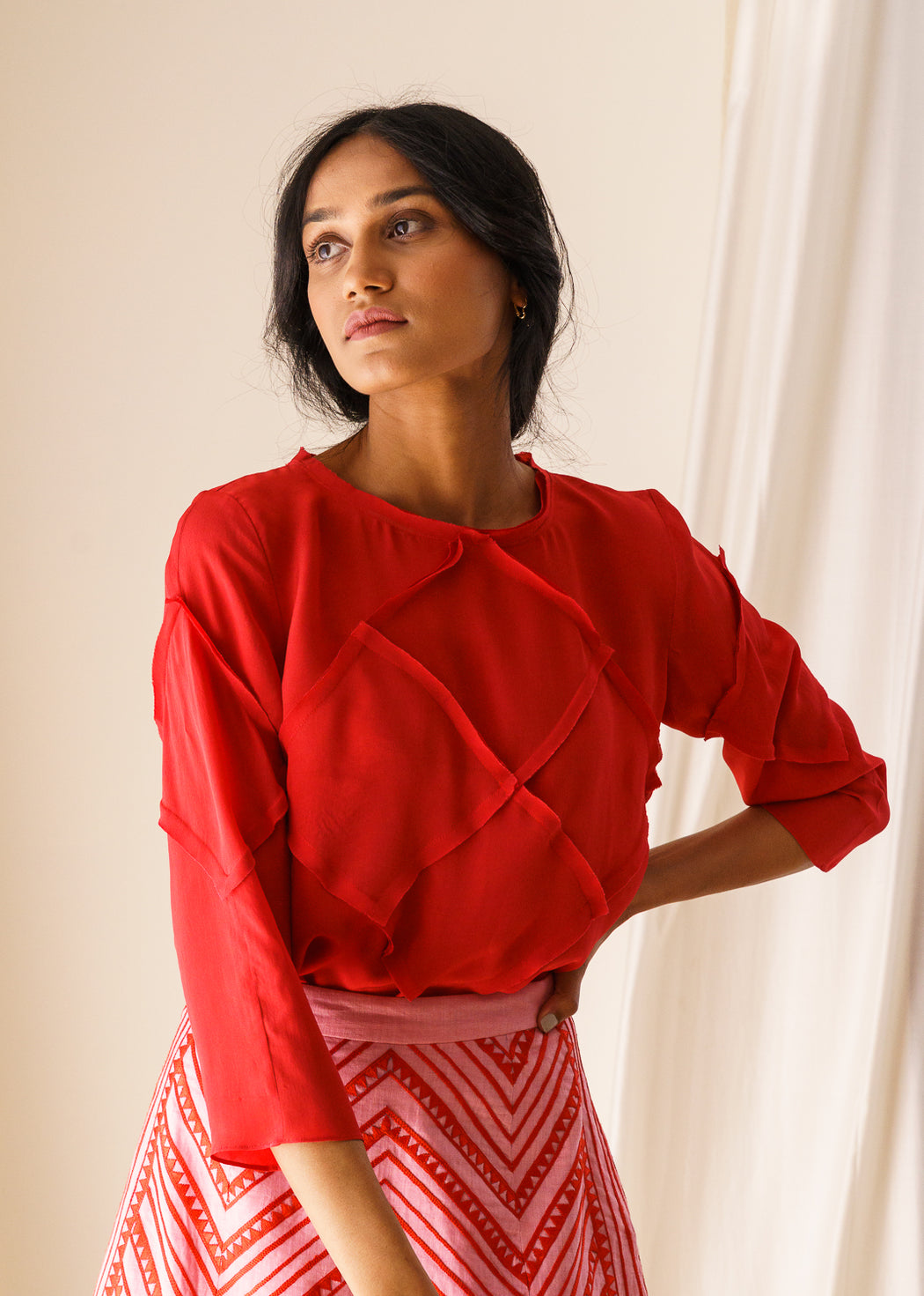 This inside out seam top is a bright red formal top made in silk crepe. To ensure practicality and breathability we made it a relaxed fit . Combine with one of our collection's bottoms, such as the Pencil Trouser or Skirt, to make a perfect outfit for that casual chic lunch or dinner. Handcrafted in India.