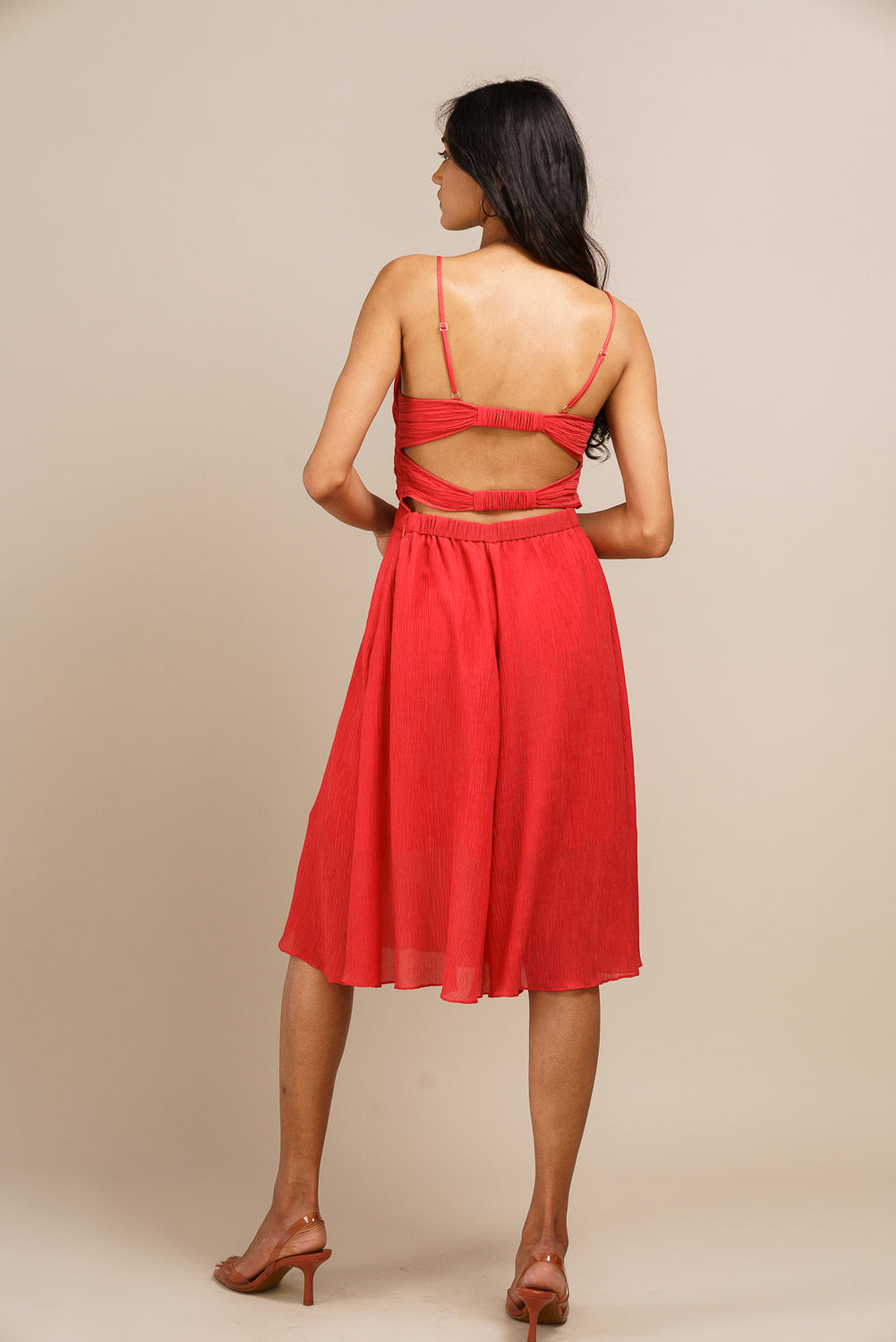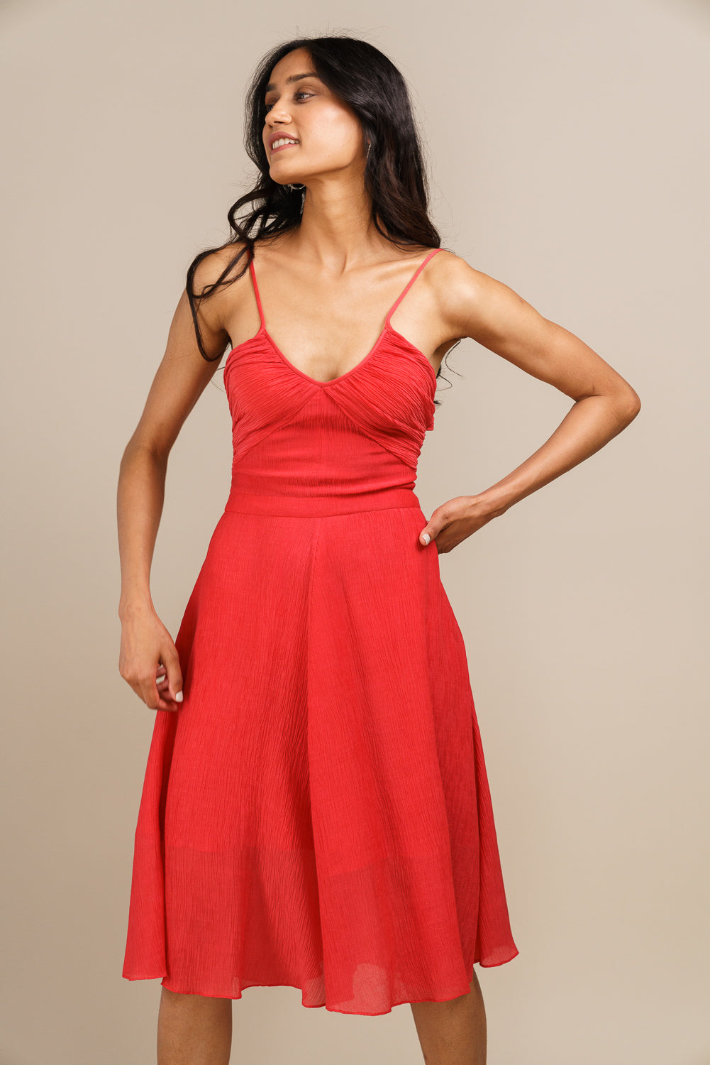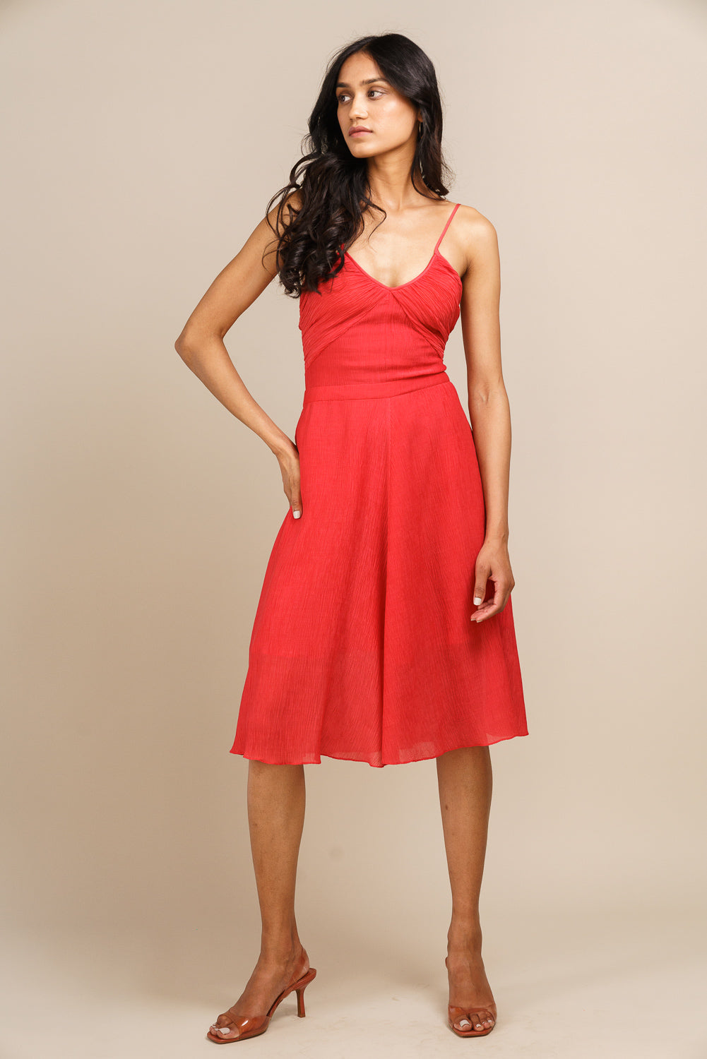 This stylish red bias cut dress is a sexy dress to dance away your nights. The back of the dress has elasticated bow like panels. This skirt is lined with fine lightweight cotton modal to avoid transparency. Perfect for a lazy or energetic summer evening. Handcrafted in India.