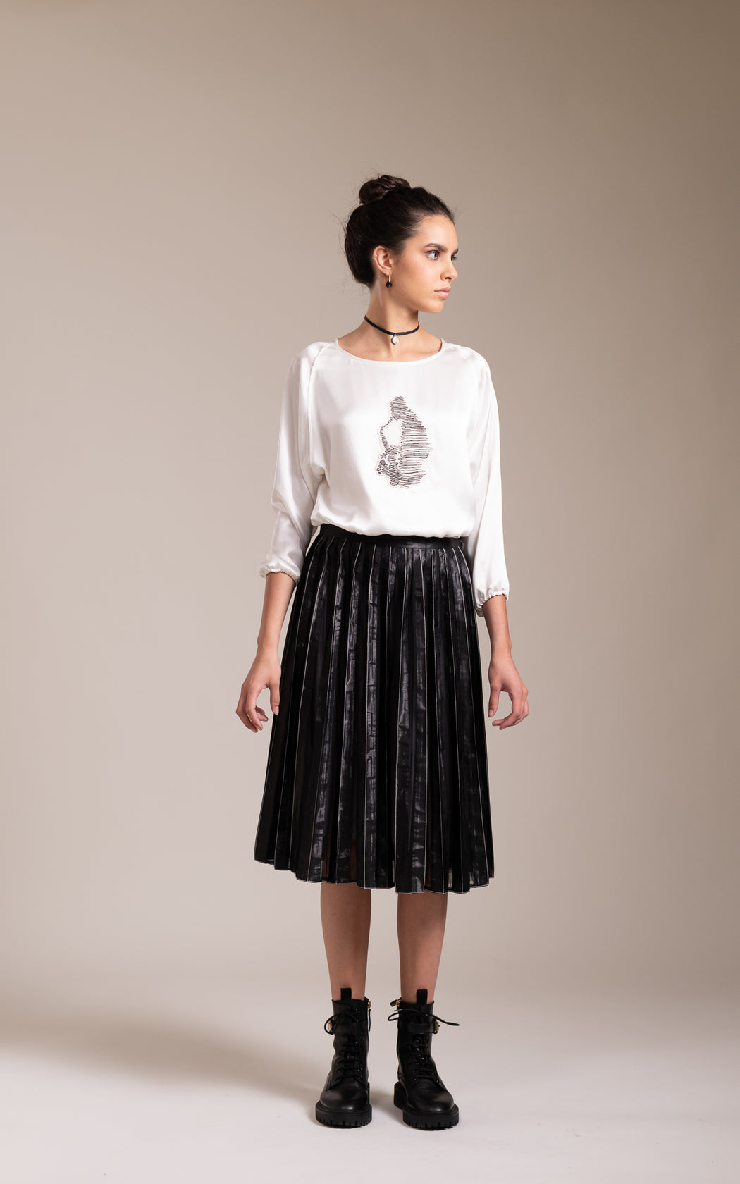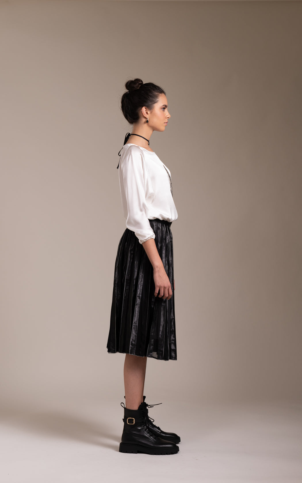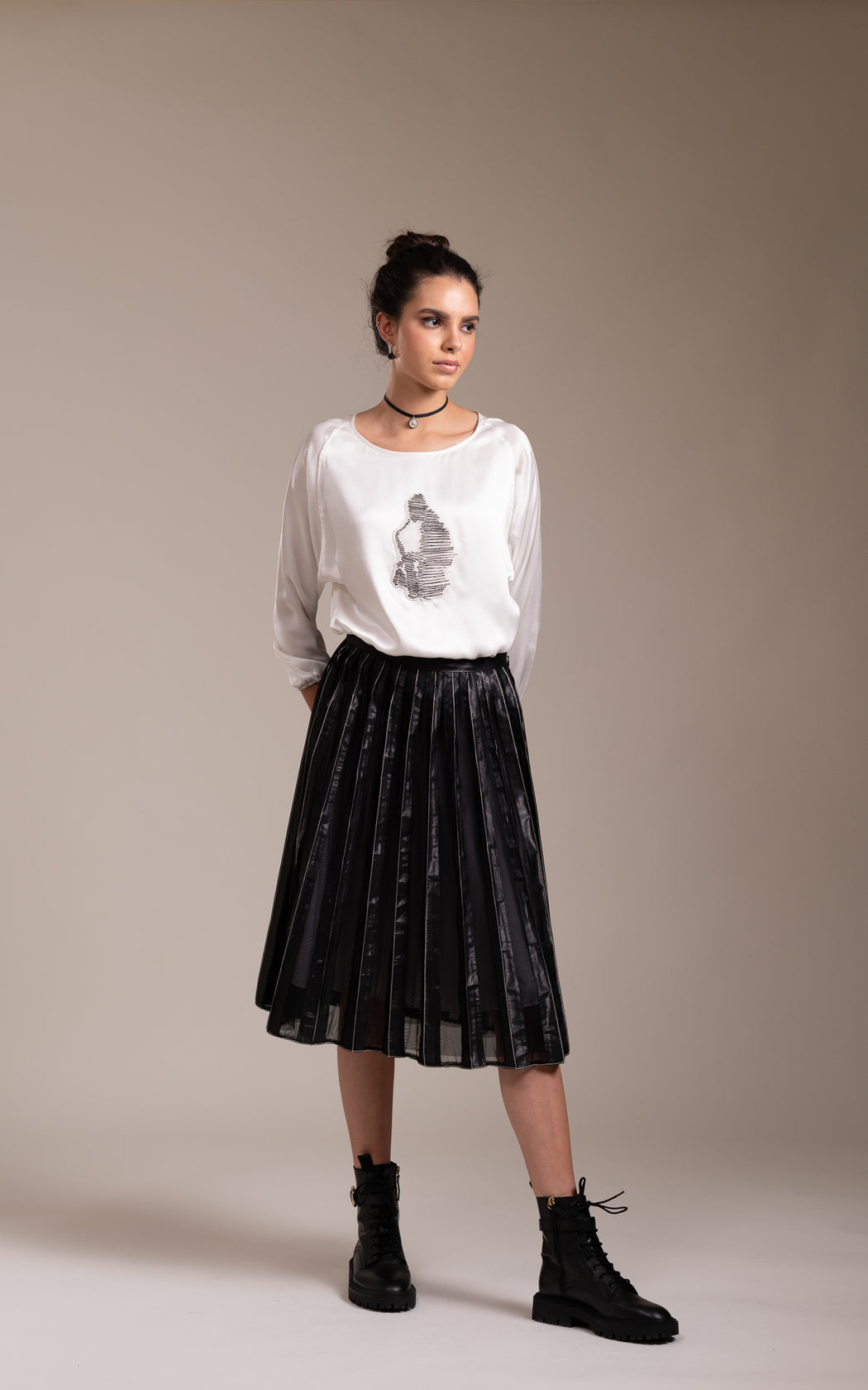 This pleated skirt is made by combining silk lurex and polyester net embellished with contrasting stitch lines. The skirt is fully lined and has fixed waist band. This chic skirt has a relaxed fit, overall a very light breezy feeling. It nestles perfectly into your elegant wardrobe or as resort wear for those easy days and evenings, especially paired with the right shirt or top. Handcrafted in India.