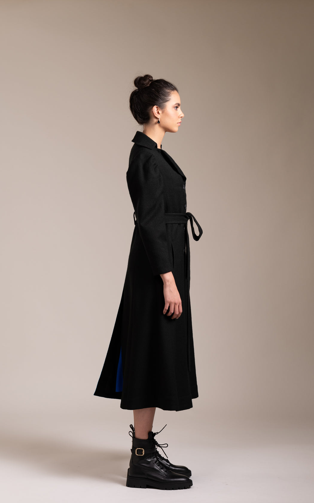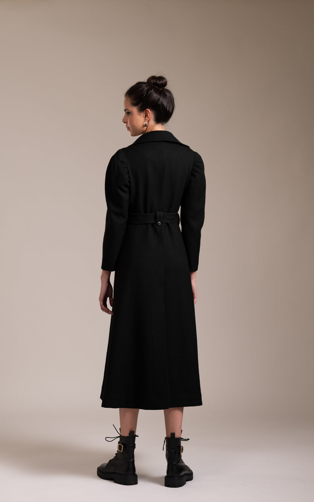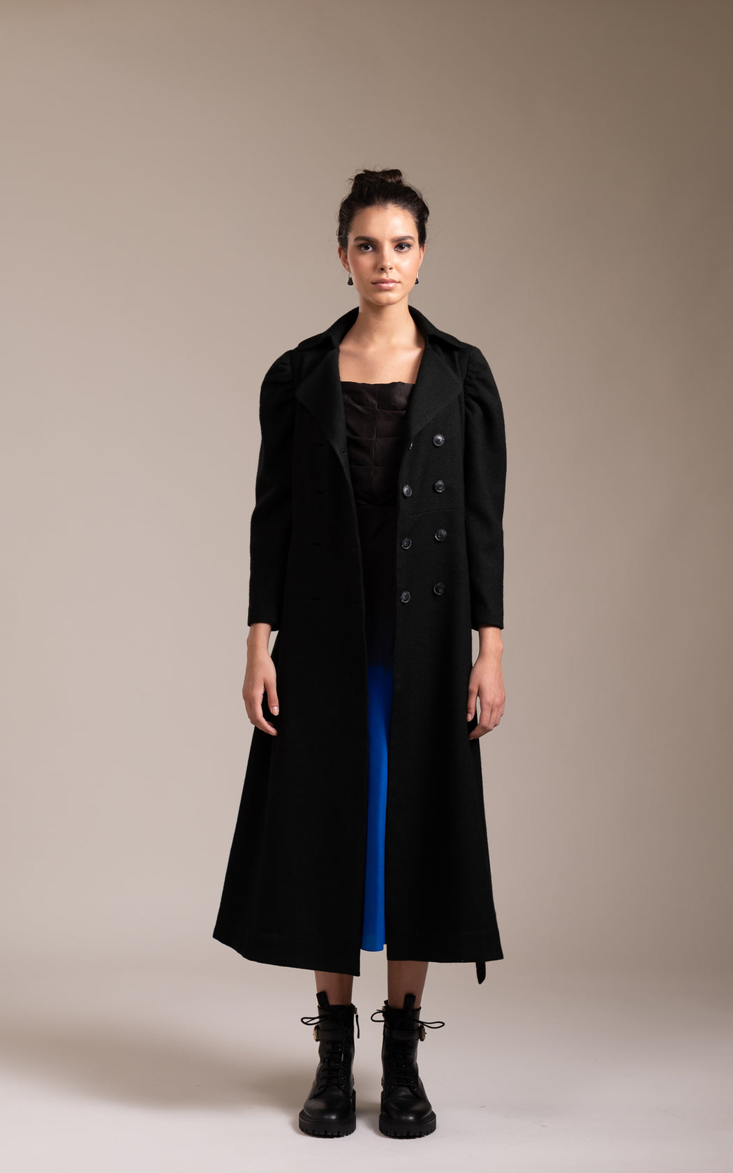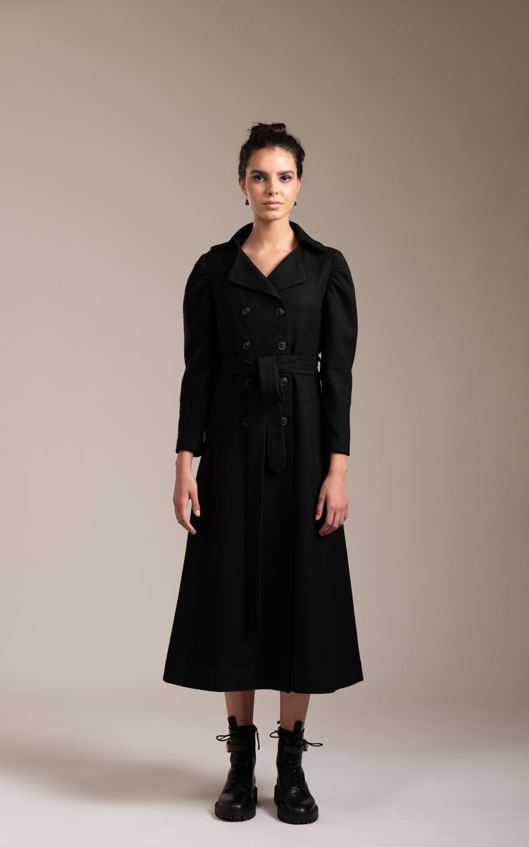 Our wool coat is a great statement piece with puff sleeves.This elegant coat is relaxed, warm and effortlessly chic. This coat is fully lined and can be used as a top layer to an outfit. Front buttoned jacket comes with a separate belt defining the waist. Handcrafted in India using almost entirely natural material.